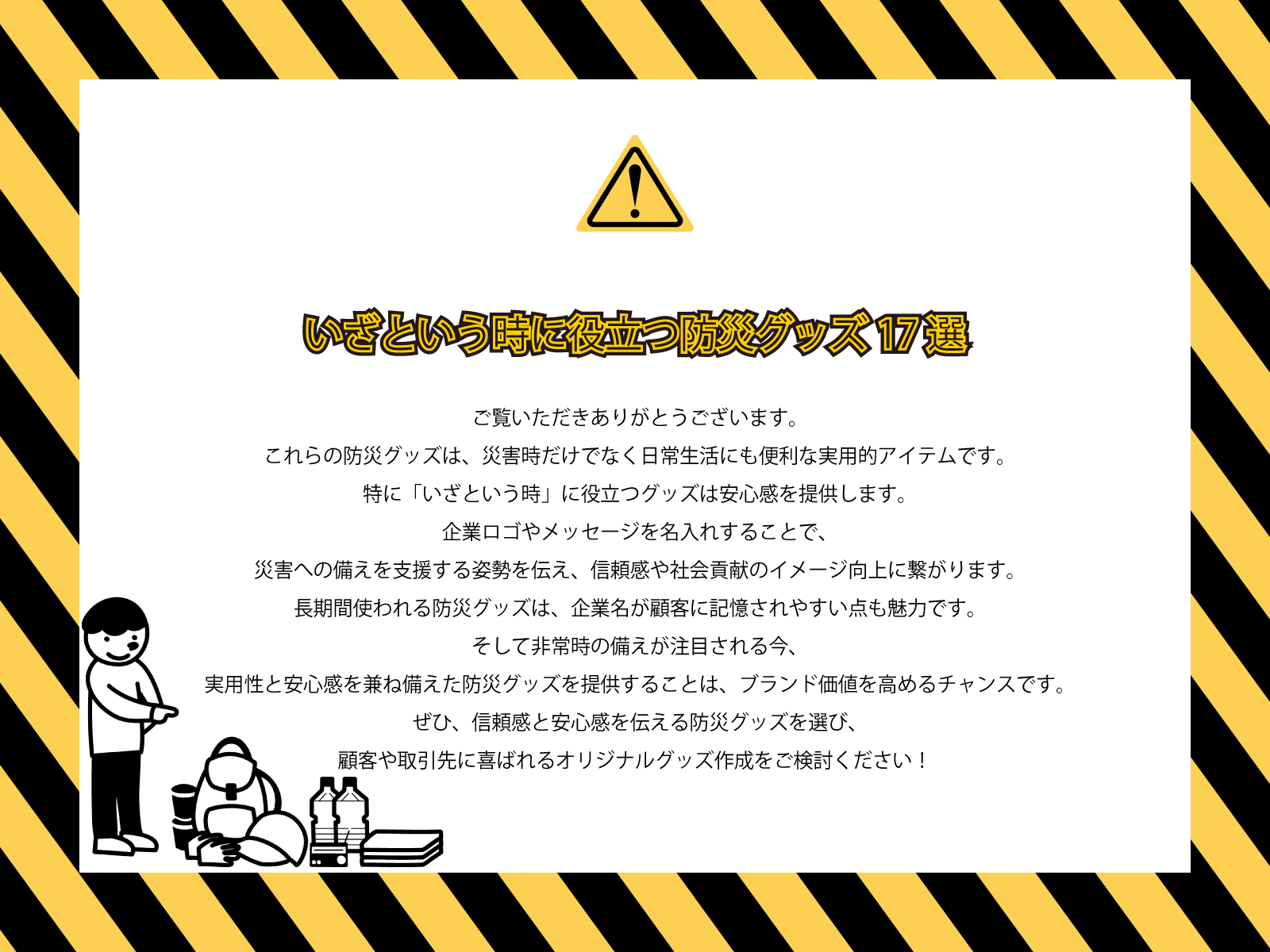 いざという時に役立つ防災グッズ17選 命を守るための防災準備 近年、自然災害が頻発し、 予測不可能な大規模な地震や台風、大雨などのリスクが高まっています。 これに伴い、家庭や職場での防災対策の重要性が一層増しています。 災害が発生した際には、迅速かつ適切な対応が生死を分けることになります。 そのため、日頃からの備えが必要不可欠です。 特に、停電や断水、交通機関の停止など、生活に必要な基本的な環境が一時的に失われる状況に備えるために、 防災グッズは欠かせません。 必要な物資を事前に揃えておくことで、万が一の時に冷静に行動でき、最悪の事態を避けることができます。 災害が起きてからでは遅いということを認識し、今こそ備えておくことが重要です。 実用的でおしゃれな防災グッズ 企業のノベルティとして配布する防災グッズは、実用性が高く非常時に役立つため、幅広い層から喜ばれるアイテムです。 いざという時の安心感を提供するだけでなく、日常使いもできるアイテムであれば、顧客に親しみを持たれ、 企業との接点を長く保つことができます。 たとえば、名入れが可能な多機能ライトや防災ホイッスルは、緊急時の備えとして役立つだけでなく、 普段から使いやすい便利なグッズとして注目されています。 また、こうした防災グッズを選ぶことは、企業が安全意識や社会貢献を重視している姿勢をアピールする機会にもなり、 ブランドイメージの向上に繋がります。 さらに、オリジナルデザインの防災グッズは、「特別感」を演出できるため、 他では手に入らない魅力的な商品として支持を集めます。 たとえば、スタイリッシュなデザインの防災用ポーチや、 カラーバリエーション豊富なフリースブランケットなどは、 実用性だけでなくデザイン性も兼ね備えているため、 日常生活に溶け込みやすいアイテムとして好評です。 それでは、名入れ可能で、企業のイメージ向上にもつながる防災グッズを2つに分けてご紹介します。 ①身の安全を守るためのアイテム ホイッスル アルミブランケット フリースブランケット 雨具 不織布マスク 折り畳みルームシューズ ガーゼタオル 抗菌ポーチ ②コンパクト・多機能アイテム 手回し充電ラジオライト 手回し充電2WAYランタン ウォータージャグ 防水バッグ 付箋付きペン 圧縮タオル 巾着リュック 吸水速乾タオル 衣類圧縮袋 ①身の安全を守るためのアイテム 災害時には、自分や周囲の人々の安全を守るためのアイテムが欠かせません。 特に、瓦礫や危険な環境下で身を守る道具や、 防寒・防塵に対応するグッズは重要な役割を果たします。 これらのアイテムは、緊急時の不安を軽減し、安心して行動するための必須ツールです。 どれも軽量で携帯しやすい設計となっており、日常的に備えておくことで、 いざというときに心強い味方となります。 1.ホイッスル 災害時に倒壊した建物に閉じ込められたり孤立した場合、 大声を出すことなく、 ホイッスルを使って体力を温存しながら助けを求めることが重要です。 高音が遠くまで響き、緊急時の存在を確実に知らせることができます。 ロゴを入れることで手軽に企業名を広められるアイテム。 非常持ち出しバッグ、キーケースなどに付けて持ち運びやすいカラビナ付きもおススメです! 2.アルミブランケット 寒さから身を守る必須アイテム! コンパクトで軽量、非常時には体温を保持し、命を守るための強力なサポートをします。 避難所や屋外での冷え込み対策にも最適! 企業ロゴ入りパッケージで販促効果を高めます。 災害時だけでなく、 アウトドアやスポーツ観戦のお供としても利用可能で汎用性の高さもポイント。 フード付きや内側を不織布素材に変更することも可能で、より機能的なデザインに。 3.フリースブランケット 災害時には体温を維持することが重要です。 フリース素材は軽量で暖かく、コンパクトに折りたたんで持ち運ぶことができるため、 非常持ち出しバッグにも収納しやすい特徴があります。 家族で使用する際や公共の場でも自然に企業ロゴが目に触れる機会が増え、 長期間にわたり販促効果を発揮します。 防災意識の高まりに応える実用的で親しみやすいノベルティとして、 ぜひお勧めしたい一品です。 4.雨具 急な雨にも対応!レインコートやポンチョで、体を濡らさず安全に避難。 コンパクトに収納でき、非常時に持ち運びもラクラク。 雨天時の移動を快適にします。 防寒具としても使えるので季節を問わず活躍します。 5.不織布マスク 災害時には煙やほこり、汚れた空気から呼吸器を守るためにマスクが非常に重要です。 また、避難所内の感染予防にも役立ちます。 実際に避難所での感染症予防に必要だったと多くの被災者からの声があります。 6.折り畳みルームシューズ 避難所や緊急時の足元を守るルームシューズは、防災グッズとして欠かせない必須アイテム。 軽量で折りたたみ可能なデザインは、持ち運びにも便利。 室内での衛
