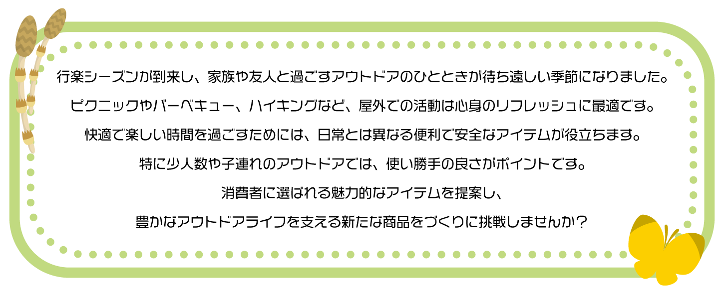 行楽・レジャーに役立つ23選 行楽やレジャーアイテムの魅力と生産のすすめ アウトドア、キャンプブームが続く中、2010年代に再び注目されたキャンプは、特にコロナ禍をきっかけに大きなブームへと加速しました。 密閉・密接・密集の「3密」を避けるため、一人キャンプや家族で楽しむグランピングが広く浸透しました。 現在では外出規制が緩和され、自由に行動できるようになったことで、人々のアクティブな気持ちが一層高まり、 自然の中でリフレッシュするレジャー体験が再評価されています。 さらに、キャンプブームが落ち着き、ひとつの文化として定着したことで、 より個性的なアイテムへの関心も高まっています。 他人と同じものを使いたくない、自分だけのこだわりを持つ人が定番ブランド以外の選択肢を求める動きも見られます。 一方で、ブームをきっかけにキャンプを始めたものの、手間や道具の準備の煩雑さからキャンプ離れしてしまった人々も 少なくありません。 しかし、便利で簡単に使えるアイテムがあれば、再びキャンプやアウトドアに興味を持つきっかけを提供できます。 新たなライフスタイルにマッチするアイテムの開発は、これからのマーケットにおいても重要です。 このような背景から、企業やブランドがオリジナルのレジャーアイテムを制作するメリットは非常に大きいと言えます。 SNSの発達も後押しし、便利なアイテムや面白いデザインの商品を作れば話題になること 間違いありません。 これらのアイテムは販促グッズやノベルティとしても非常に効果的です。 本コラムでは、OEM生産が可能なレジャーアイテムとその特徴についてご紹介します。 ぜひ、オリジナルグッズ制作の参考にしてください。 それでは、厳選した15種類のアイテムをご紹介します。 行楽・レジャーグッズ一覧 ポータブル低反発クッション ポータブルエアクッション レジャーシート 折り畳みチェア 折り畳み式テーブル 折り畳み式ローテーブル ポップアップテント ダウンブランケット 難燃性ブランケット レインポンチョ カトラリーセット ケース付きスタッキングカップ 真空ステンレスタンブラー ステンレスフードポット 真空ステンレスボトル ランチBOX メスティン 折りたたみバケツ ボックス型保冷トート ハンドル付きクーラーバッグ ハンドル付きコンパクトコンテナ 手回し充電2WAYランタン スマホ充電ダイナモライト 1.ポータブル低反発クッション アウトドア活動に最適なポータブル低反発クッション。 低反発素材が体圧を均等に分散し、長時間座っていても快適さを保ちます。 軽量で持ち運びも簡単なので、旅行やキャンプ、スポーツ観戦にもぴったり。 カバー素材やカラーのカスタマイズでオリジナリティを演出できます。 2.ポータブルエアクッション 旅行やキャンプ、アウトドアで活躍するポータブルエアクッション。 軽量でコンパクトに収納、必要な時に簡単に膨らませて使用できます。 収納スペースを取らず携帯性に優れているため持ち運びが簡単。 アウトドアだけでなく車や電車での長時間移動の際も役立ちます。 カスタマイズして、 企業名やロゴをプリントした特別なノベルティとしても活躍します。 3.レジャーシート ピクニックやキャンプ、スポーツ観戦に便利なレジャーシート。 大きく広げて使えるため、家族や友人と一緒に楽しい時間を過ごすのに最適です。 汚れに強く、すぐに拭き取れるため、外での食事や休憩でも快適。 貴社のイベントやキャンペーンでお客様へのギフトとしてもおすすめ。 オリジナルデザインやロゴを印刷すれば、企業の認知度向上にも貢献します。 4.折り畳みチェア ピクニックやキャンプで大活躍! 軽量&コンパクトで、持ち運びも簡単。 子供でも簡単に扱える設計が人気のポイントです。 企業の展示会やイベントに参加される際、 ロゴを入れたオリジナルデザインのチェアを提供することで、 ブランドを強く印象づけることができます。 5.折り畳み式テーブル バーベキューやキャンプ、ピクニックなどのアウトドアシーンの必需品。 スタイリッシュなデザインで、自宅の庭やバルコニーでも活躍します。 使わないときはコンパクトに収納でき、持ち運びが簡単です。 雨や風に強い素材や加工でより一層快適に使用することができます。 企業のプロモーションイベントや社員向けの福利厚生品としてもおすすめ。 6.折り畳み式ローテーブル 折りたたみ式なのでコンパクトに持ち運べて使う時も楽々。 屋外での食事や作業にぴったりです。 キャンプやバーベキュー、お花見やピクニックなど様々なレジャーで活躍。 低めの高さで安定感があるので、ソロキャンプやテント内で重宝されます。 木材やアルミ素材などアレンジ可能。 7.ポップアップテント アウトドアイベントや展示会で大活躍するポップアップテント。 開くのが簡単で、設営に時間がかからず、 誰でもすぐに快適な空間を作ることができます。 UVカット機能や風対策も施され
