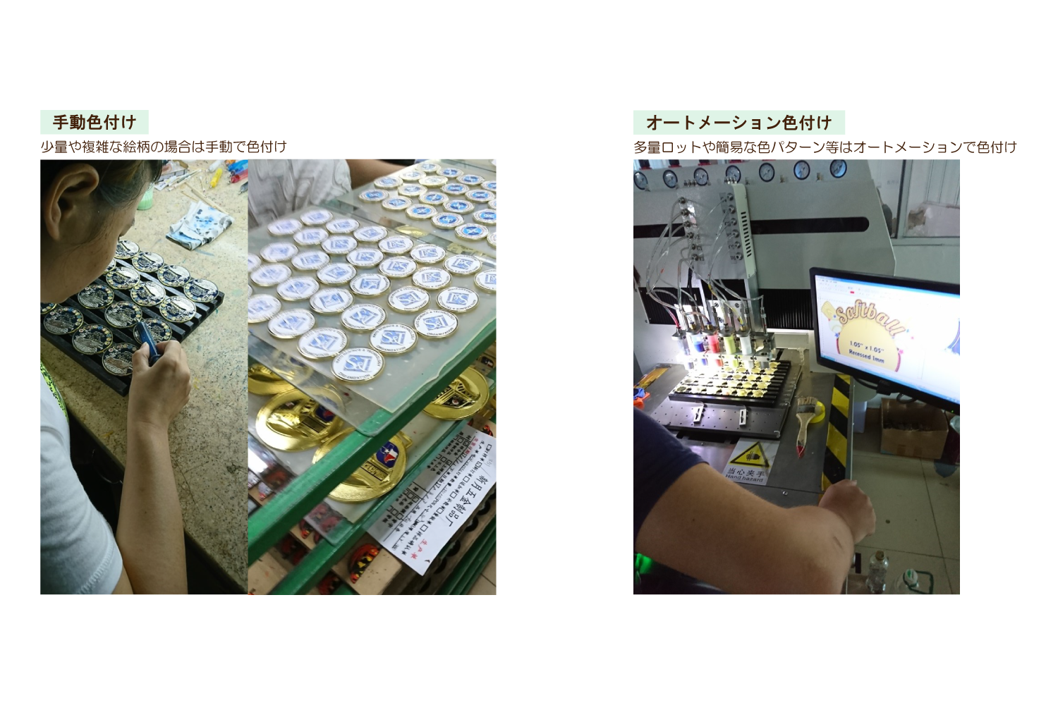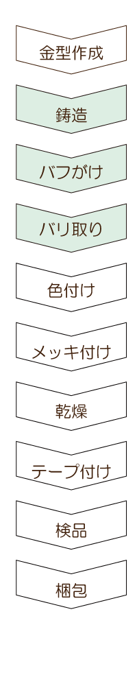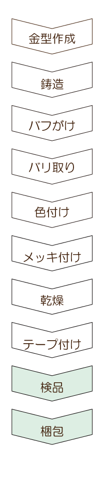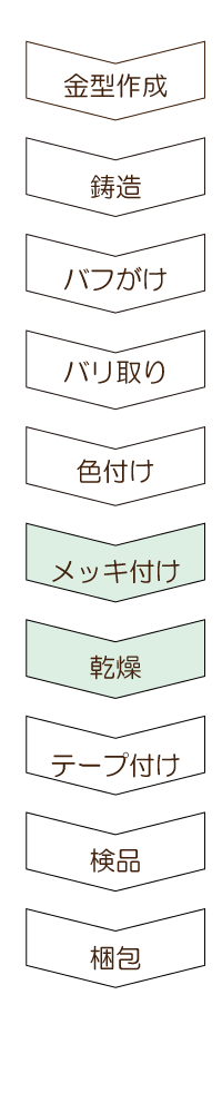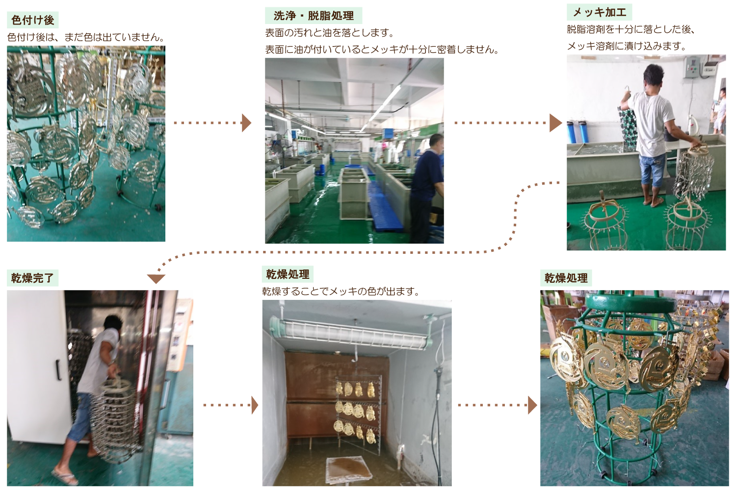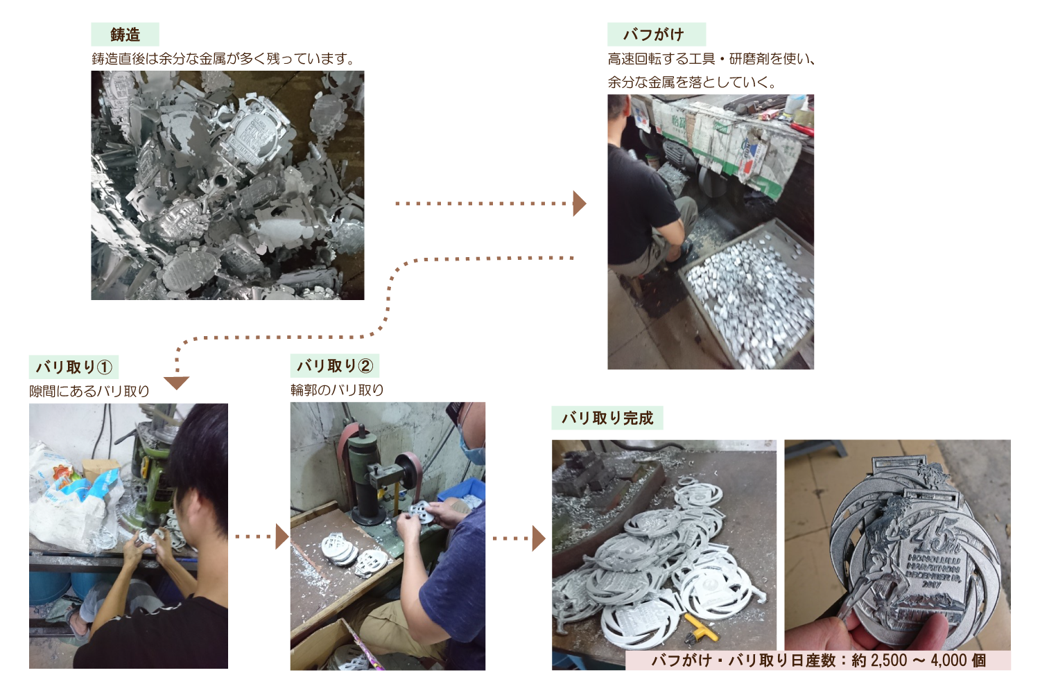 ~ オリジナルメダル ご納品までの流れ ~ 1. 案件内容をヒアリングさせて頂き、クライアント様のニーズを把握。 2. クライアント様のニーズに合致する商品のお見積り、商品サンプル、デザインイメージのご提案。 3. 弊社提携の中国工場にて生産。縫製品から成形物まで幅広く、オリジナル対応が可能です。 4. 通常は工場内にて検品(検針)を行いますが、ご希望によって弊社提携の第三者機関検品対応も可能です。 5. 国内での検品、各種アッセンブリ対応も可能です。お気軽にお問い合わせください。 中国工場にて生産 所在地:中国広東省中三市(メッキ加工は中国全土で一番の技術力と規模) 工場は各工程に分かれており、約20km内にある4工場をしようして完成