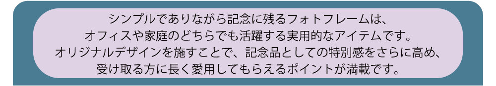 商品 フォトフレーム 対応可能数量 500個~(商品仕様や案件ごとに異なります。) サイズ 工場有り型 本体色 PANTONE指定 or 工場対応可能色から選択 対応可能素材 PP、ABS、天然木、ガラス 対応可能加工 – 名入れ シルク印刷、パッド印刷 、転写印刷、UV印刷 サンプル データ入稿後 約10~15日後 スケジュール 校了後 約40日~ (お急ぎの場合はご相談ください) その他 –