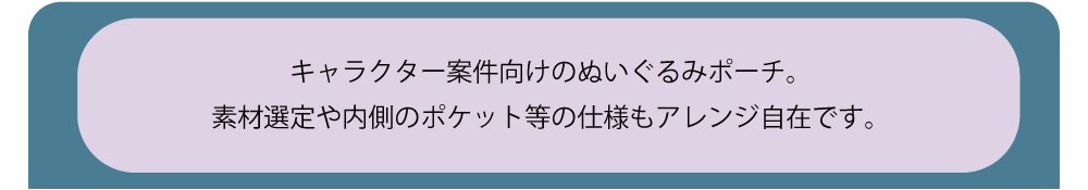 商品 ぬいぐるみポーチ 対応可能数量 500個~(商品仕様や案件ごとに異なります。) サイズ オリジナル形状対応可能 本体色 PANTONE指定 or 工場対応色より選択 対応可能素材 ポリエステル 他 対応可能加工 – 名入れ 刺繍、タグ付け サンプル データ入稿後 約10~15日後 スケジュール 校了後 約40日~ (お急ぎの場合はご相談ください) その他 スリーブケース入り、化粧箱入り対応可能