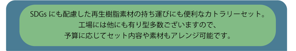 商品 カトラリーセット 対応可能数量 500個~(商品仕様や案件ごとに異なります。) サイズ 工場有型 本体色 PANTONE指定 対応可能素材 再生PET樹脂、竹繊維樹脂、PP 対応可能加工 抗菌加工 名入れ シルク印刷、パッド印刷、インクジェット印刷、転写印刷、UV印刷、オフセット印刷 サンプル データ入稿後 約10~15日後 スケジュール 校了後 約40日~ (お急ぎの場合はご相談ください) その他 化粧箱、スリーブケース入り等アレンジ可能