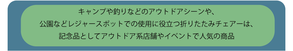 商品 折り畳みチェア 対応可能数量 500個~(商品仕様や案件ごとに異なります。) サイズ 工場有型 本体色 PANTONE指定 or 生地帳より選択 対応可能素材 ポリエステル、綿、アルミ、PU、本革 対応可能加工 撥水加工 名入れ シルク印刷、パッド印刷、インクジェット印刷、転写印刷、UV印刷、オフセット印刷、タグ付け サンプル データ入稿後 約10~15日後 スケジュール 校了後 約40日~ (お急ぎの場合はご相談ください) その他 アルミ蒸着、ポケット、ファスナー等アレンジ可能