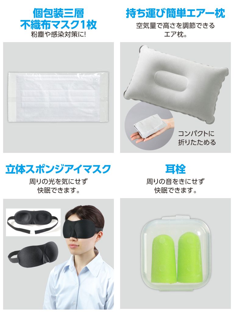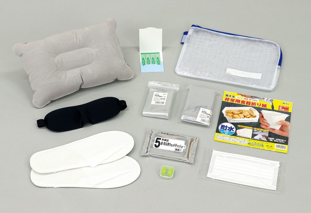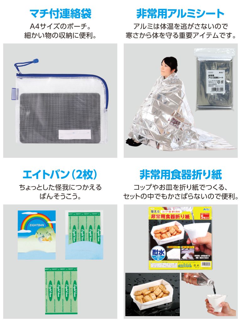 ‘マチ付連絡袋×1、非常用アルミシート×1、ばんそうこう(2枚)×1、非常用食器折り紙×1、不織布マスク×1、持ち運び簡単エアー枕×1、立体スポンジアイマスク×1、耳栓×1組、非常用アルミ防寒寝袋×1、不織布スリッパ×1組、防災用ウェットティッシュ×1