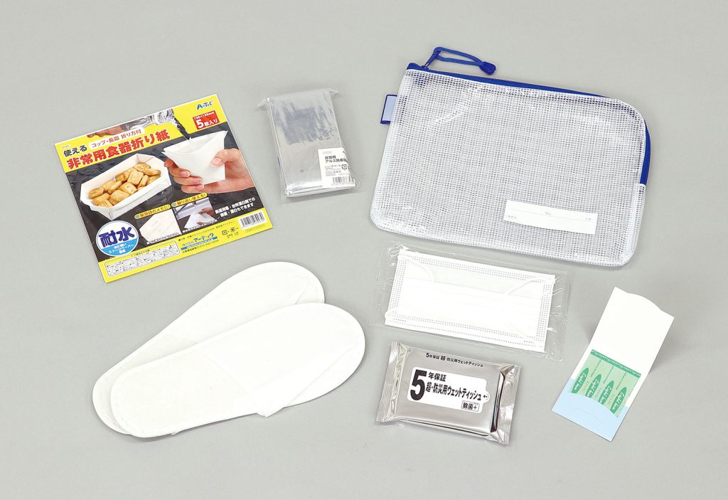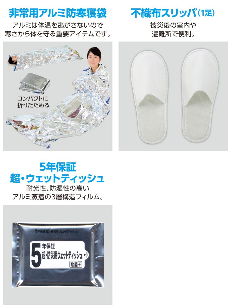 ‘マチ付連絡袋×1、ばんそうこう(2枚)×1、非常用食器折り紙×1、不織布マスク×1、非常用アルミ防寒寝袋×1、不織布スリッパ×1組、防災用ウェットティッシュ×1