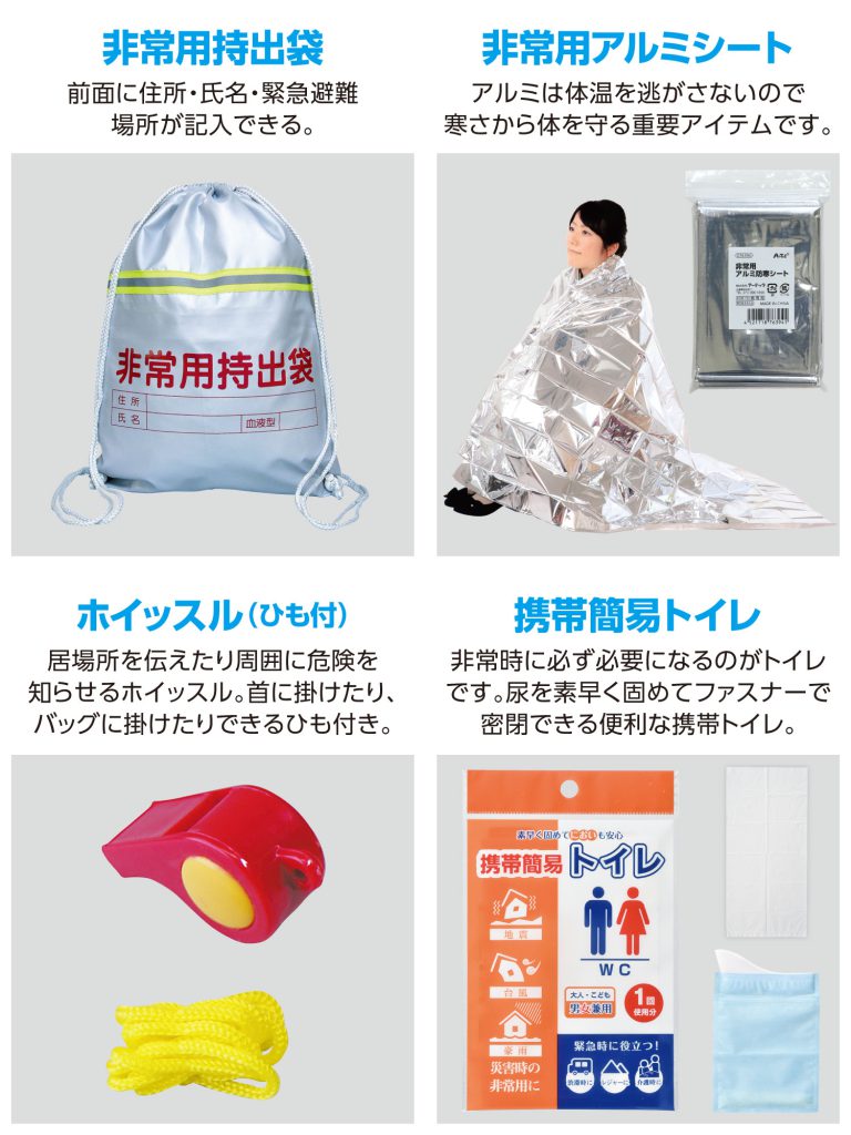 非常用持出袋×1、非常用アルミシート×1、ホイッスル(ひも付)×1、携帯簡易トイレ×1、ばんそうこうセット(5枚、綿棒10本)×1、非常用食器折り紙×1、不織布マスク×1、非常用給水袋5L×1、LED懐中電灯×1、単1乾電池(2本組)×1、持ち運び簡単エアー枕×1、立体スポンジアイマスク×1、耳栓×1組