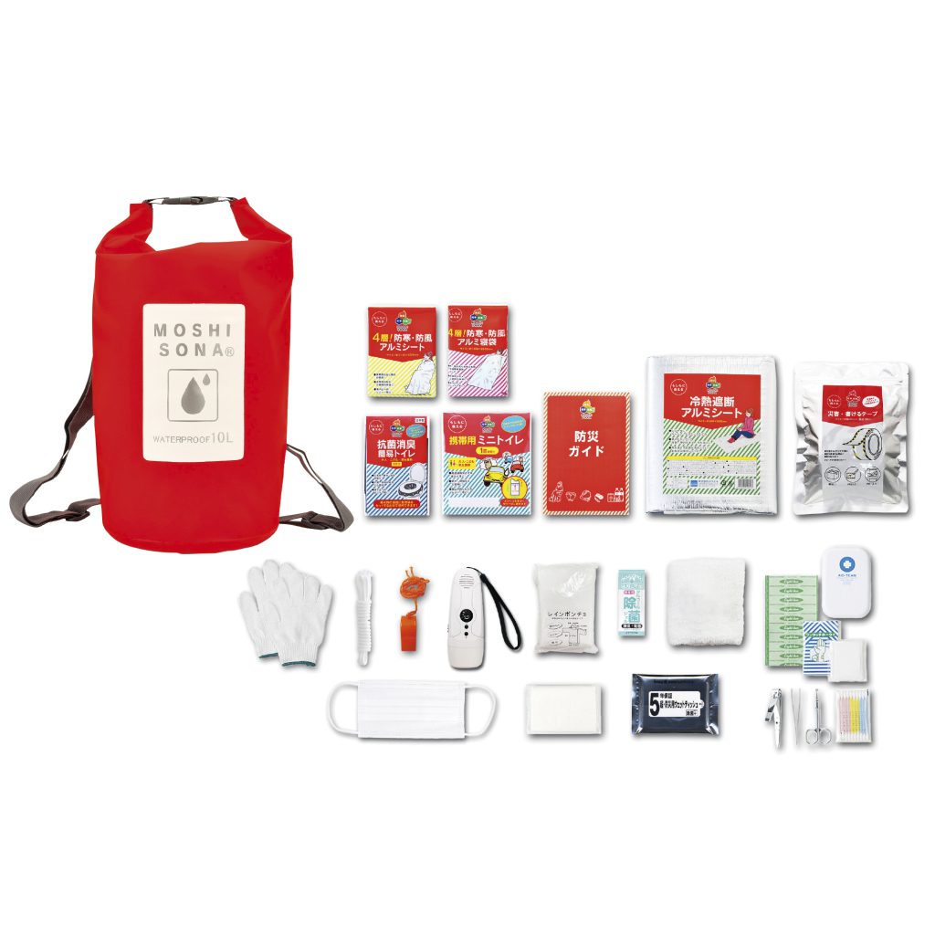 ①防水deリュック、②4層!アルミシート、③4層!アルミ寝袋、④抗菌消臭・簡易トイレ、⑤携帯用ミニトイレ、⑥防災ガイド、⑦冷熱遮断アルミシート、⑧災害・書けるテープ、⑨軍手、⑩ロープ、⑪笛、⑫スマホ対応ダイナモFMラジオLEDライト(※Ⓑ)、⑬レインポンチョホワイト、⑭除菌ジェル、⑮タオル、⑯マスク、⑰ポケットティッシュ、⑱防災用ウェットティッシュ(20枚入)、⑲絆創膏5枚、⑳綿棒10P、㉑コットンパフ3枚、㉒ワンタッチ包帯、㉓爪切り、㉔毛抜き、㉕ハサミ(※Ⓑ)携帯電話充電器機能は、スマートフォン、iPhone 対応可(一部未対応機種あり)。スマートフォン、iPhone のケーブルは付属しておりません。