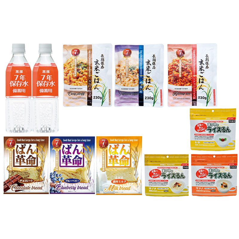 ①7年保存500ml ×3本 ②ぱん革命・チョコレート×1袋 ③ぱん革命・ブルーベリー×1袋 ④ぱん革命・北海道濃厚ミルク×1袋 ⑤長期保存玄米ごはん カレーピラフ×1袋 ⑥長期保存玄米ごはん 和風味×1袋 ⑦長期保存玄米ごはん ケチャップライス×1袋 ⑧ライスるん・白米+ホタテ貝カルシウム入×1袋 ⑨ライスるん・野菜&きのこ×1袋 ⑩ライスるん・五目がゆ×1袋