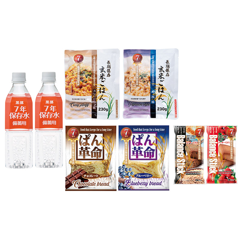 ①7年保存500ml ×2本 ②ぱん革命・チョコレート×1袋 ③ぱん革命・ブルーベリー×1袋 ④長期保存玄米ごはん カレーピラフ×1袋 ⑤長期保存玄米ごはん 和風味×1袋 ⑥バランススティック・セサミエスプレッソ×1袋 ⑦バランススティック・スイートストロベリー×1袋