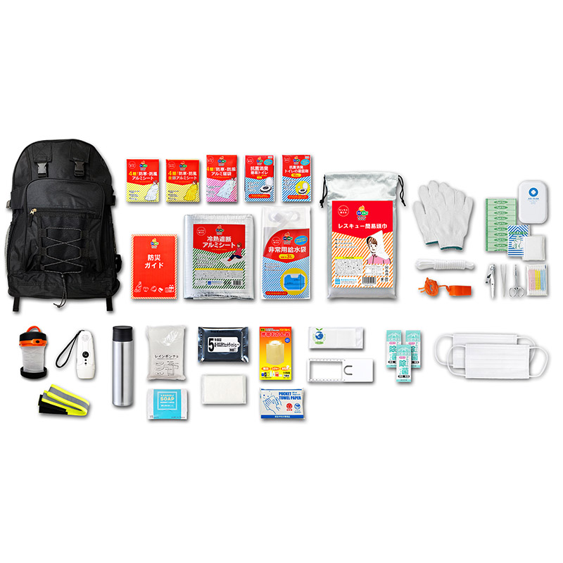 セット内容:①大容量リュック、②4層!防寒・防風アルミシート、③4層!防寒・防風金銀アルミシート、④4層!防寒・防風アルミ寝袋、⑤抗菌消臭・簡易トイレ、⑥抗菌消臭トイレの凝固剤10P、⑦防災ガイド、⑧冷熱遮断アルミシート、⑨非常用給水袋3L、⑩レスキュー簡易頭巾、⑪軍手、⑫ロープ、⑬笛、⑭飛び出せ!ランタン(単3電池×3本使用 別売)、⑮新反射安全タスキ、⑯スマホ対応ダイナモFMラジオLEDライト(※Ⓑ)、⑰防災用ウェットティッシュ(20枚入)、⑱eco便利バッグ、⑲真空ステンレスボトル350ml、⑳レインポンチョホワイト、㉑おかん器、㉒しおり拡大鏡、㉓㉔マスク×2、㉕㉖㉗除菌ジェル×3、㉘ペーパーソープ(10枚入)、㉙ポケットティッシュ、㉚絆創膏5枚、㉛綿棒10P、㉜コットンパフ3枚、㉝ワンタッチ包帯、㉞爪切り、㉟毛抜き、㊱ハサミ、㊲ポケットタオルペーパー10枚